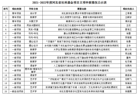 按照《关于做好2021-2022年度河北省社会科学基金项目申报工作的通知》要求,经校内评审,现将拟推荐申报的项目予以公示。公示期为2021年5月5日至2021年5月7日。公示期内,任何单位或个人如有异议,请以书面形式向科研处反映。