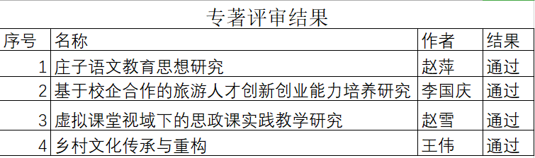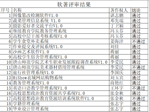 2019年8月20日,由我校学术委员会及校内外专家组成的评审组对本次提交的软件著作权、专著、横向课题和决策咨询报告进行了评审,现将结果公示如下: