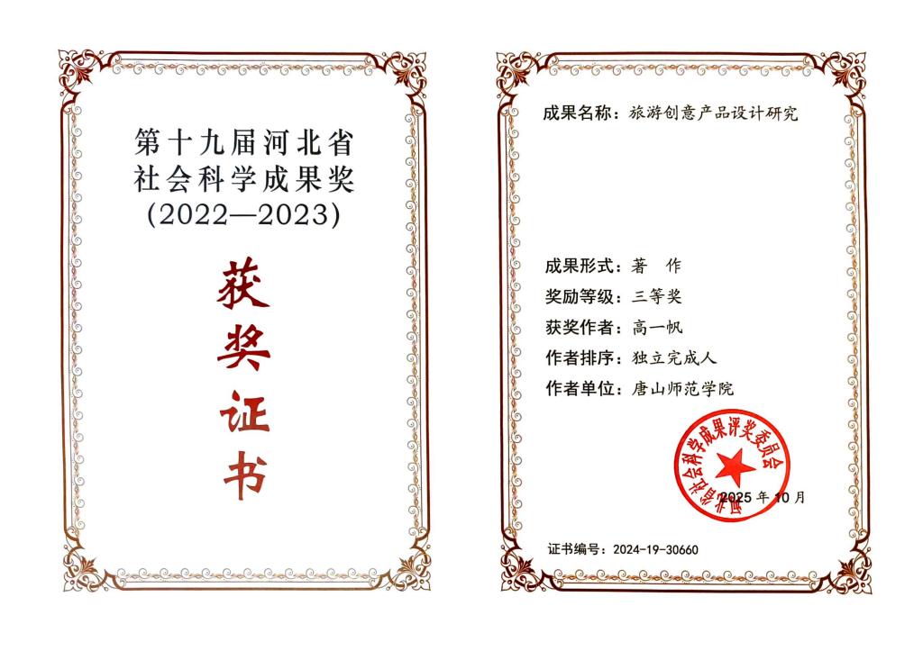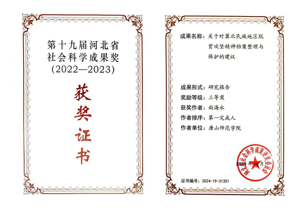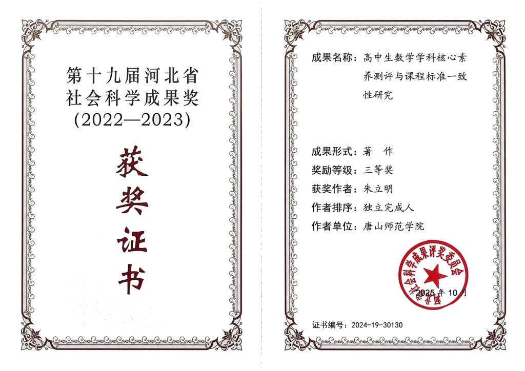 根据《河北省社会科学评奖办公室关于表彰第十九届河北省社会科学成果奖获奖成果的决定》相关文件 ,经过个人申报和单位公示推荐、资格审查、推荐单位公示通过资格审查成果、学科组初评、省评审委员会终评、 评审结果公等程序,我校推荐申报的4项成果获奖,其中朱立明老师申报的《高中生数学学科核心素养测评与课程标准一致性研究》,尚海永老师申报的《关于对冀北民族地区脱贫攻坚精神档案整理与保护的建议》,高一帆老师申报的《旅游创意产品设计研究》荣获三等奖。